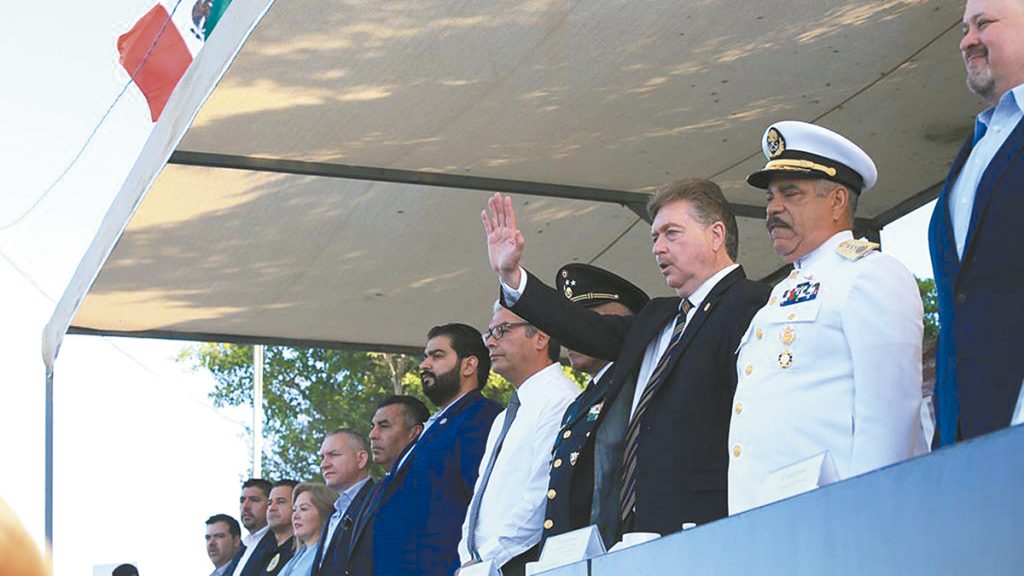 MEXICALI.- El Gobernador Francisco Vega de Lamadrid, acompañado de su esposa, señora Brenda Ruacho de Vega, del Comandante de la II Región Militar, General de División D.E.M. Gabriel García Rincón; el Comandante de la Segunda Región Naval, Almirante C.G. D.E.M. José Luis Cruz Ballado, y miembros del Gabinete, encabezó el acto protocolario de honores a la bandera, para después presenciar el desfile cívico militar.