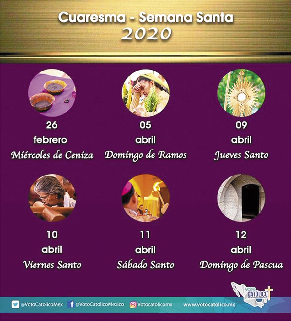Con el miércoles de ceniza inicia la #Cuaresma, un tiempo litúrgico de 40 días previó a Semana Santa. Es un período especial para el encuentro con Dios, con nosotros mismos y con los demás. A continuación te compartimos las fechas más importantes de la #Cuaresma2020,#VotoCatólico