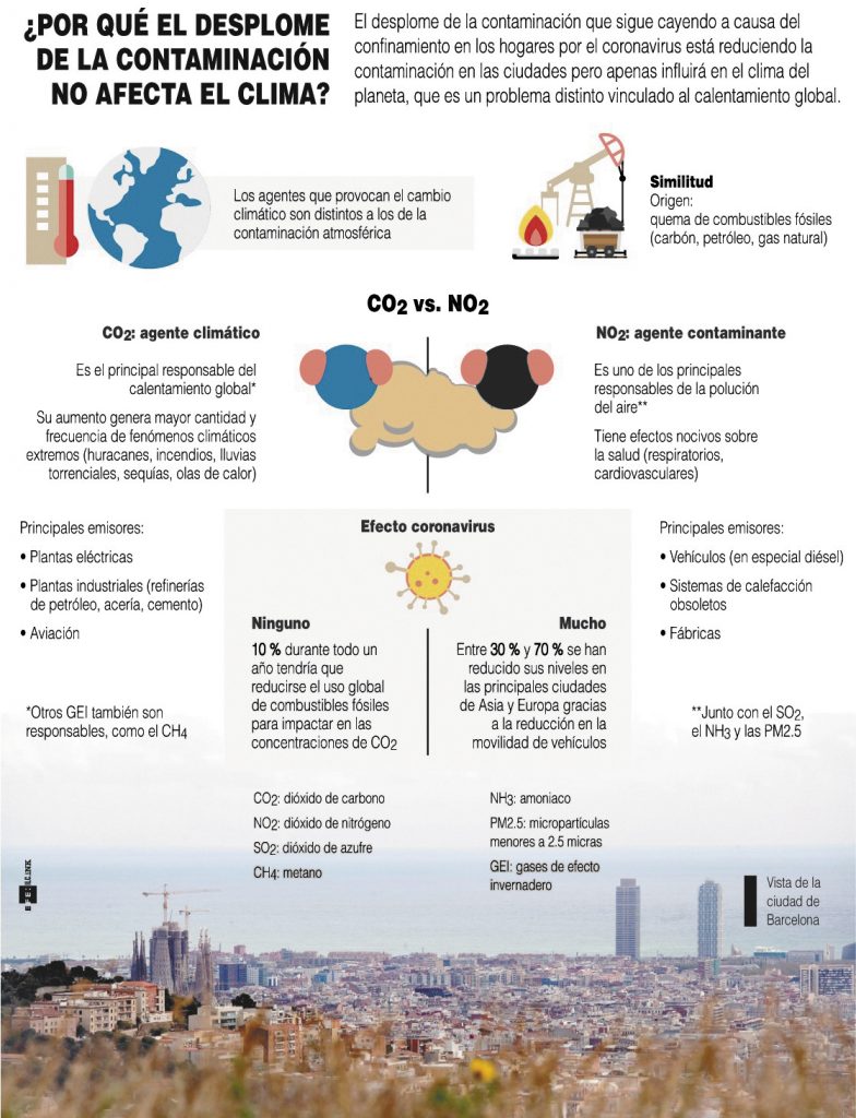 El desplome de la contaminación que sigue cayendo a causa del confinamiento en los hogares por el coronavirus está reduciendo la contaminación en las ciudades pero apenas influirá en el clima del planeta, que es un problema distinto vinculado al calentamiento global. EFE