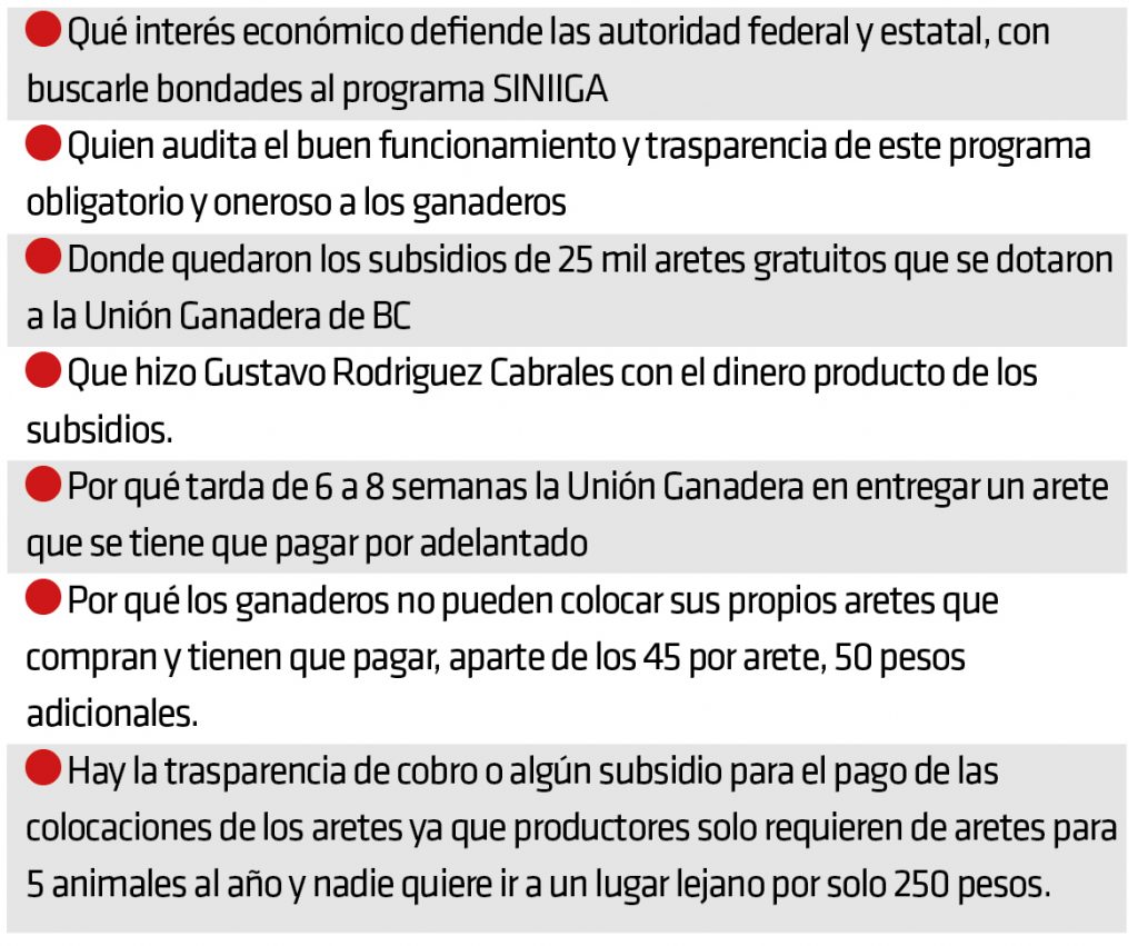 Por todo lo anterior, no deja de sorprendernos como la autoridad federal y estatal en materia de ganadería sigue respaldando el mal actuar de la organización ganadera, a nivel nacional y regional, que tiene en exclusividad la concesión de la venta, distribución y registro del SINIIGA. No logramos entender como distraen la atención en buscar las bondades de un programa de identificación individual ganadero con un negocio lleno de corrupción, favoritismo, simulación de datos, engaño a las autoridades federales mexicanas, así como a las de Estados Unidos de América.