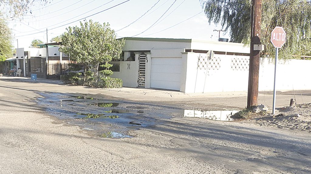 MEXICALI. – El constante desbordamiento de agua negras en el sistema de drenaje en la confluencia de Av. de las Nubes y Paseo del Agua, en el Fraccionamiento Jardines de San Marcos, ha provocado una serie de baches en la importante vialidad que comunica a este Fraccionamiento con Villafontana, independientemente de que esa vialidad de liga caree de pavimento y es la que más baches tiene por metro cuadrado.