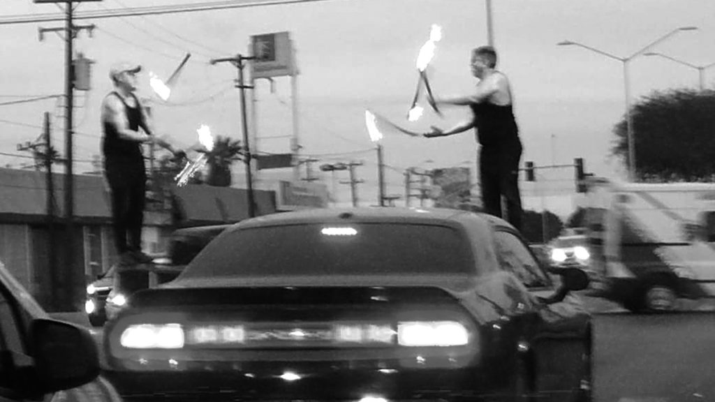 Dos malabaristas trabajan en un crucero de la ciudad, ante una leve capa de contaminación | Rafael Pérez Limón.