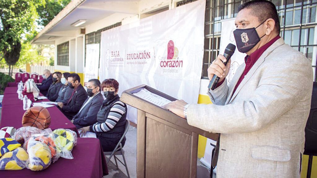 TIJUANA. – Autoridades de Baja California realizaron la entrega simbólica de inmobiliario, material didáctico y deportivo, y pintura a docentes de educación básica para el logro de sus alumnos.