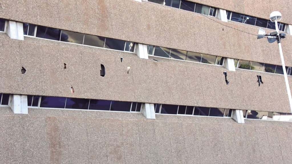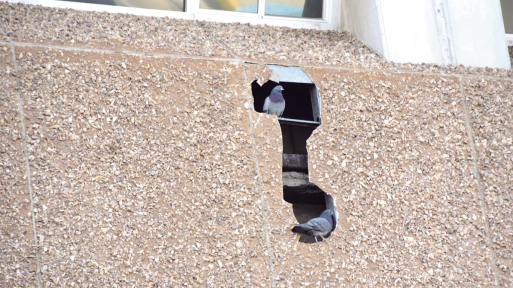 MEXICALI. – El lente critico nos muestra los daños ocasionados en la fachada poniente del edificio del Poder Ejecutivo en el Centro Cívico, mismos que los pichones están utilizando como nido.