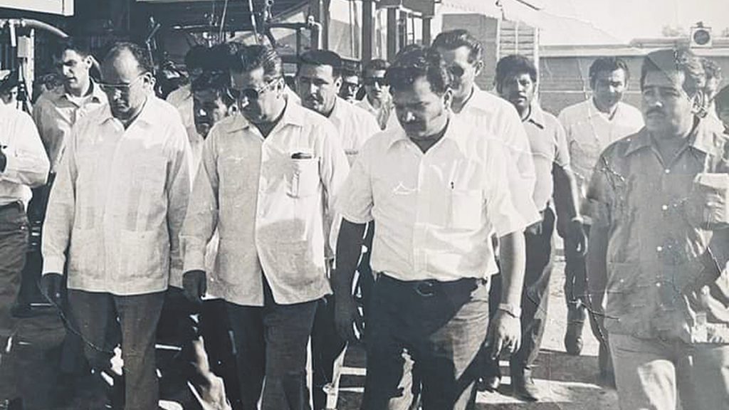 Presidente Echevarría durante una visita a la Sociedad Cooperativa Lázaro Cárdenas, a su izquierda, el gobernador Milton Castellanos, Salvador Campos, de Banco Rural y César Villalobos, atrás, Jesús Avitia y Francisco Santana Peralta, secretario general de gobierno.