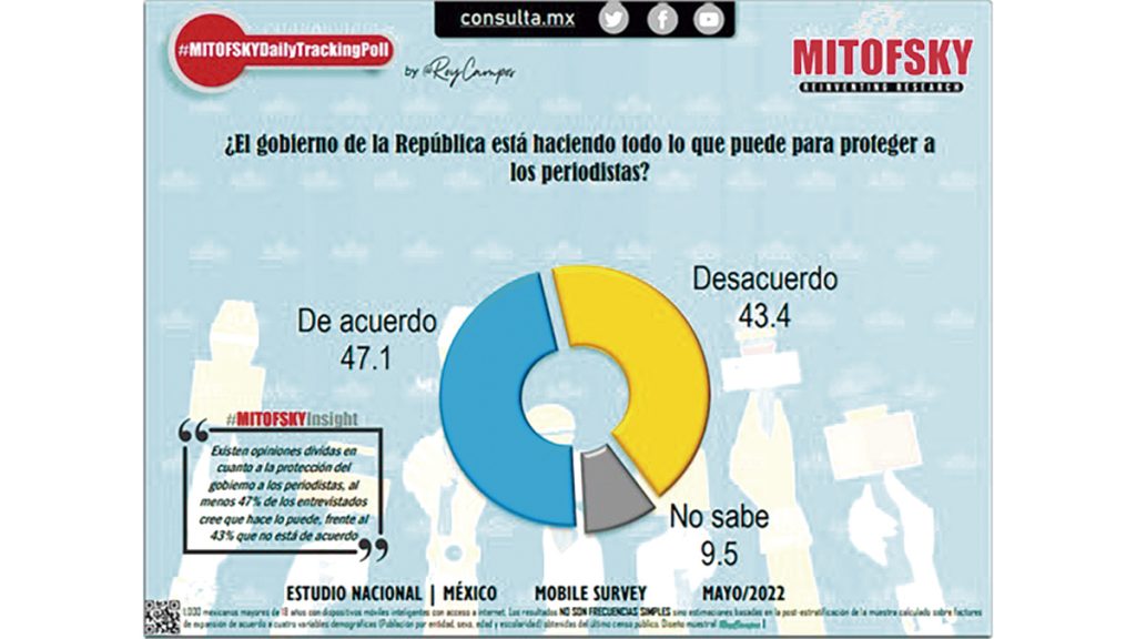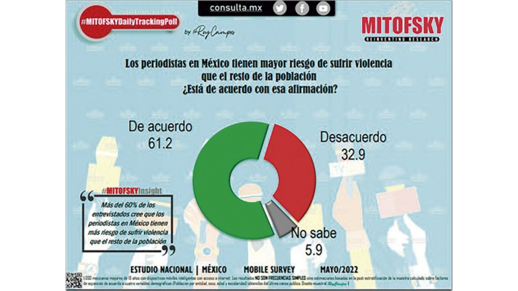 Pese a esta percepción de «libertad de prensa», más de la mitad (61.2%) de las personas consultadas por la casa de encuestas dirigida por Roy Campos opinó que los periodistas sí se enfrentan a un mayor riesgo a sufrir violencia que el resto de la población en México.