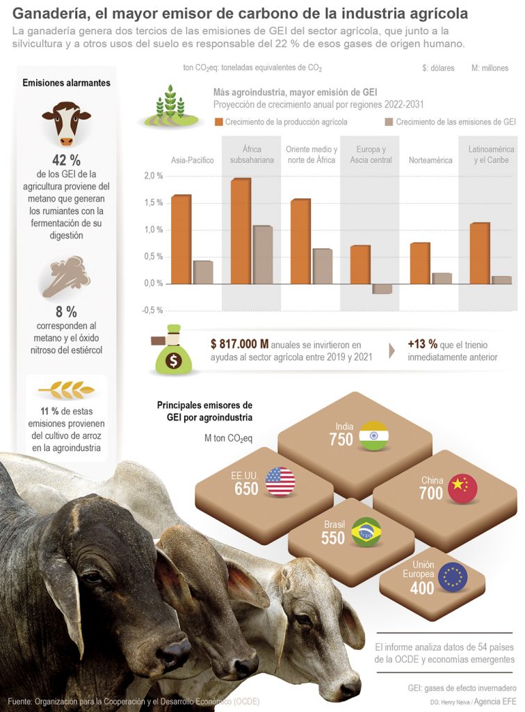 En un informe publicado este jueves, en el que analiza los datos de sus 48 países miembros y de once grandes economías emergentes, la Organización para la Cooperación y el Desarrollo Económico (OCDE) explica que solo el metano que generan los rumiantes con la fermentación de su digestión supone el 42 % de las emisiones causantes del efecto invernadero de la agricultura.