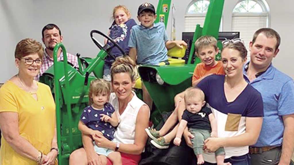 La familia del agricultor Ralph Griesbaum, del condado de Marion, Missouri, quien murió trágicamente en un accidente de tractor volcado en 2018, posa en una exhibición permanente en el edificio de la Oficina Agrícola de Missouri en el recinto ferial estatal. Un fondo conmemorativo establecido por Griesbaums pagó la exhibición