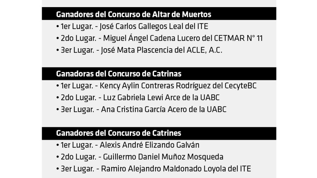 Los ganadores de los primeros lugares fueron: altar de José Carlos Gallegos Leal del ITE y como catrín y catrina Kency Aylin Contreras Rodríguez del CecyteBC y Alexis André Elizando Galván