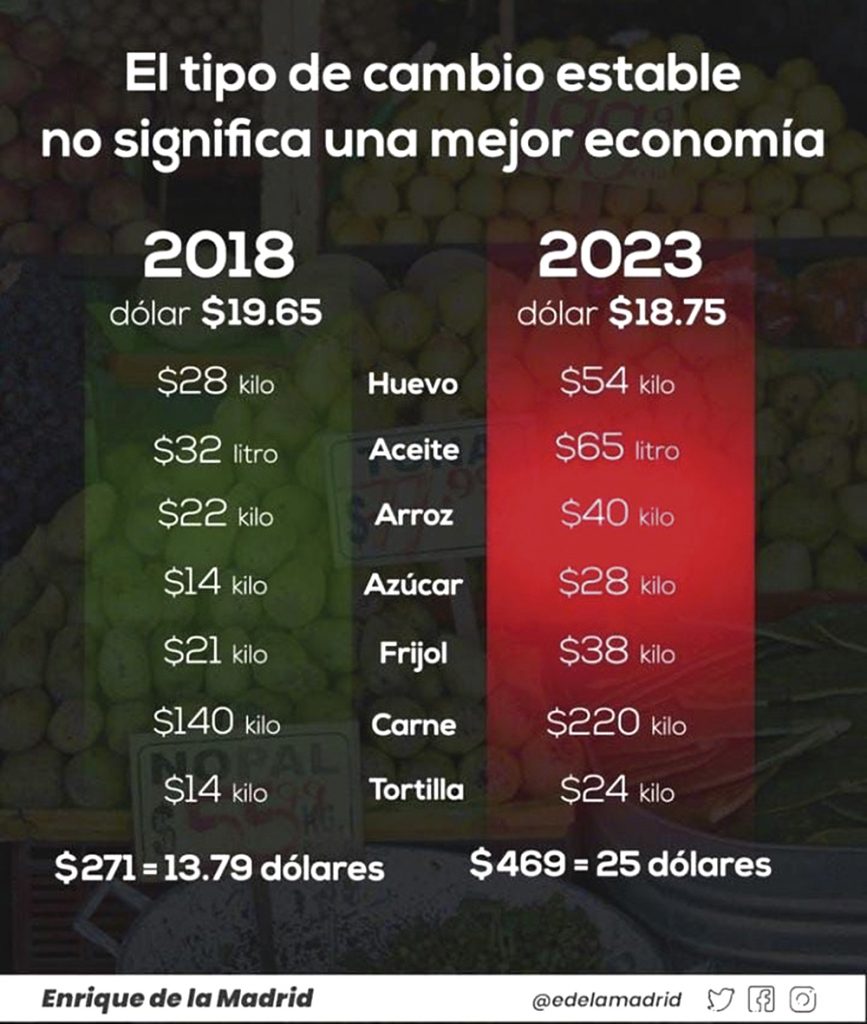 Contrario a la opinión de quienes cantan victoria por la fortaleza del peso frente al dólar, ponderándola como un acierto del manejo económico del presidente Andrés Manuel López Obrador, ignoran que el desfasamiento de la inflación, al alza, encarece los productos de la canasta básica y nulifica cualquier cotización del peso, como se muestra en la grafica siguiente: