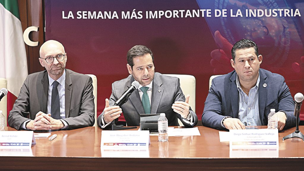MEX8318. CIUDAD DE MÉXICO (MÉXICO), 21/06/2023.- El director general de Italian German Exhibition Company para Canadá, EE. UU. Y México, Bernd Rohde (i), el presidente de la Confederación de Cámaras Industriales de los Estados Unidos Mexicanos (CONCAMIN), José Abugaber (c), y el gobernador del estado de Guanajuato, Diego Sinhue Rodríguez (d), participan hoy, durante una rueda de prensa en la Ciudad de México (México). La Reunión Anual de Industriales (RAI) de México y la Industrial Transformation Mexico (ITM), que se celebrarán en octubre en el céntrico estado de Guanajuato, abordarán la relocalización de empresas, conocida como "nearshoring", y la transición ecológica. EFE/José Méndez