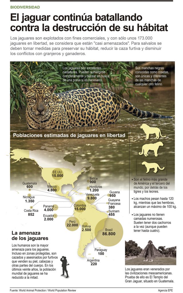 Para frenar su amenaza, organizaciones trabajan en el ‘Plan jaguar 2030’, que busca una cooperación internacional y fortalecer un corredor que asegure la conectividad de 30 paisajes prioritarios, desde México hasta Argentina, con el objetivo de garantizar la supervivencia de la especie. EFE