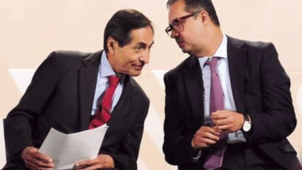 Rogelio Ramírez de la O y Gabriel Yorio, secretario y subsecretario de Hacienda, dialogan durante una conferencia en Ciudad de México, en abril de 2023.DANIEL AUGUSTO