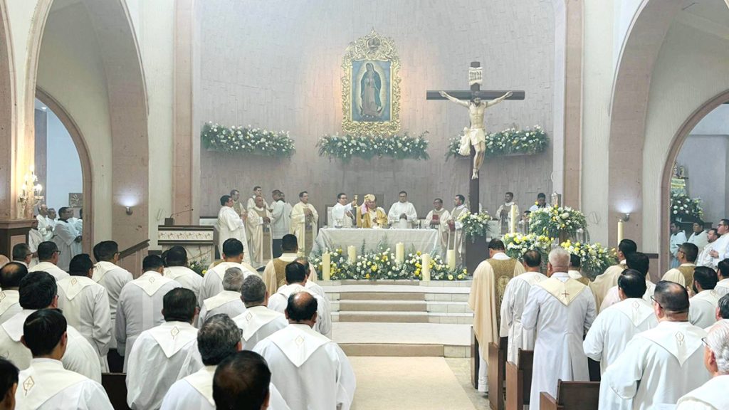 Hoy martes 26 de marzo se llevó a cabo la Misa Crismal en la Catedral de Nuestra Señora de Guadalupe, presidida por Mons. Enrique Sánchez Martínez, Obispo de Nuestra Diócesis de Mexicali, acompañado por Sacerdotes de la Diócesis. El Obispo en la homilía recuerda que los Sacerdotes son ordenados como ministros, llamados a formar y dirigir al pueblo Sacerdotal, ofreciendo en su nombre el sacrificio Eucarístico a Dios en la Persona de Cristo. ¨Hoy al renovar las promesas Sacerdotales, renovamos el firme propósito de ser imagen cada vez más fiel de Cristo, Sumo Sacerdote. Queremos imitar al Buen Pastor en especial al ofrecer día tras día la vida por la salvación de nuestro pueblo que se ha encomendado a nuestro cuidado¨, menciona Monseñor Enrique. En esta celebración después de la homilía el Obispo invitó a los sacerdotes a realizar la renovación de las promesas sacerdotales, prometiendo solemnemente unirse más de cerca a Cristo y a la Iglesia. Se consagró el Santo Crisma por parte del Obispo y al finalizar la celebración, los Sacerdotes se llevaron a cada una de sus comunidades el Santo Crisma y los óleos. La Misa Crismal es la celebración en la que se consagra el Santo Crisma (de aquí el nombre de misa crismal); y bendice además los restantes óleos o aceites (para los enfermos y los que se van a bautizar). El crisma es la materia sacramental con la cual son ungidos los nuevos bautizados, son signados los que reciben la confirmación y son ordenados los obispos y sacerdotes, entre otras funciones. La consagración del crisma y la bendición de los otros dos aceites ha de ser considerada como una de las principales manifestaciones de la plenitud sacerdotal del obispo. Así como el óleo de los catecúmenos y de los enfermos. Todos ellos son aceites a base de aceite de oliva y otros aromas. Ordinariamente esta celebración se debe de llevar a cabo el jueves Santo, pero por razones pastorales se adelanta a este martes Santo.