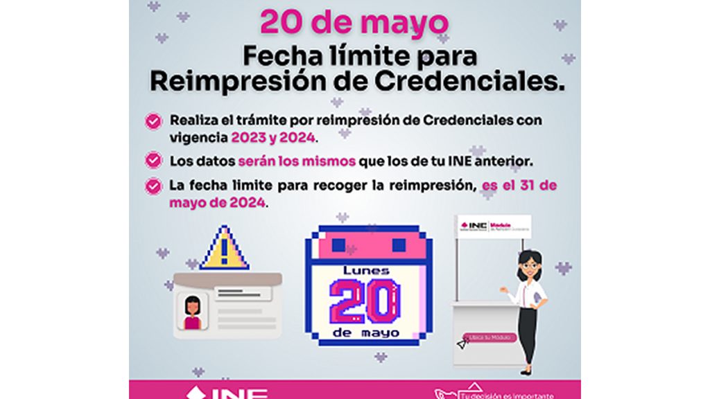 El Instituto Nacional Electoral (INE) informa a la ciudadanía en general que el próximo 20 de mayo vence el plazo para solicitar la reimpresión de su Credencial para Votar (sin cambio de datos) y la fecha límite para recogerla es a más tardar el próximo 31 de mayo, a fin de que pueda participar en la Jornada Electoral del 2 de junio de 2024.