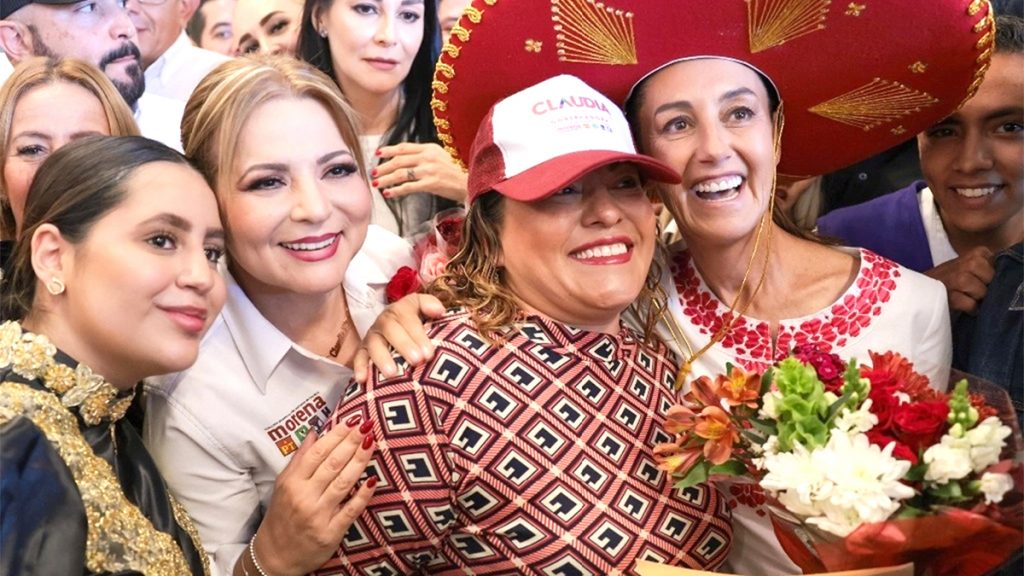 Sheinbaum estuvo ayer en Tlajomulco de Zúñiga, Jalisco, acompañada por la candidata a gobernadora, Claudia Delgadillo (segunda de izquierda a derecha). ‘Foto La Jornada’