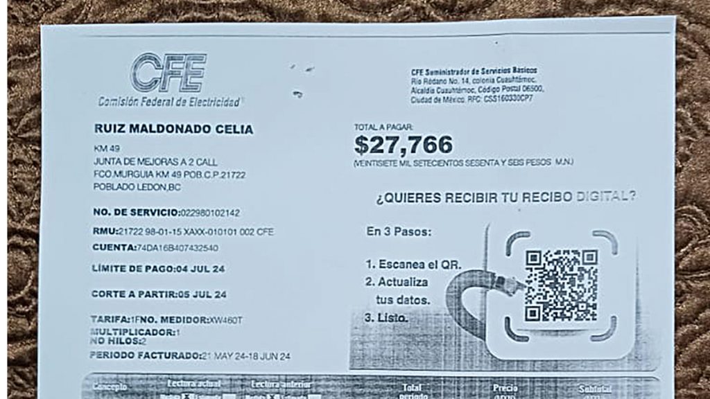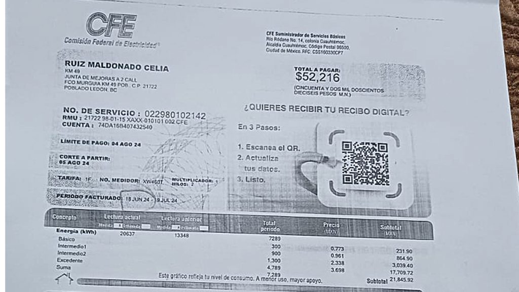 Como ejemplo de ello  la señora Celia Ruiz Maldonado, del poblado de Ledón, a quien le facturan 23 mil 593.59, más un adeudo anterior de 27 mil 216.50, haciendo un total de  52 mil 216.50.