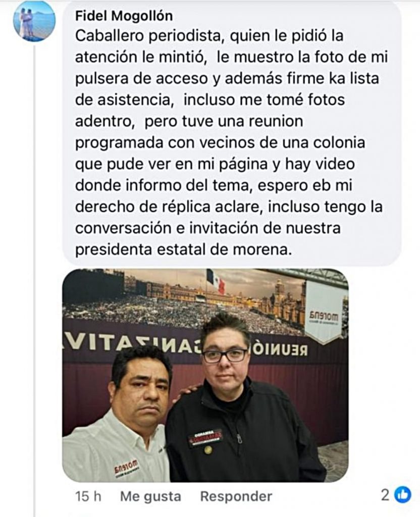 Como que le estaban reclamando que fue de colado al evento de Tijuana, con la dirigencia nacional de Morena y para defenderse subió foto de su pulsera de acceso y la imagen con Samaniego.