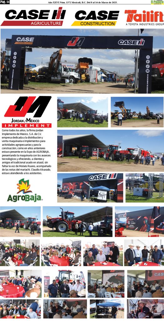 Como todos los años, la firma Jordan Implemente de Mexico, S.A. de C.V. empresa dedicada a la distribución y venta maquinaria e implementos para actividades agropecuarias y para la construcción, como en años anteriores estuvo presente en la Expo de AGROBAJA, presentando la maquinaria con los avances tecnológicos y ofreciendo, a clientes y amigos el tradicional asado en ataúd, sin faltar la voz de Moisés Ruano, acompañado de las notas del mariachi. Claudio Alvarado, estuvo atendiendo a los asistentes.