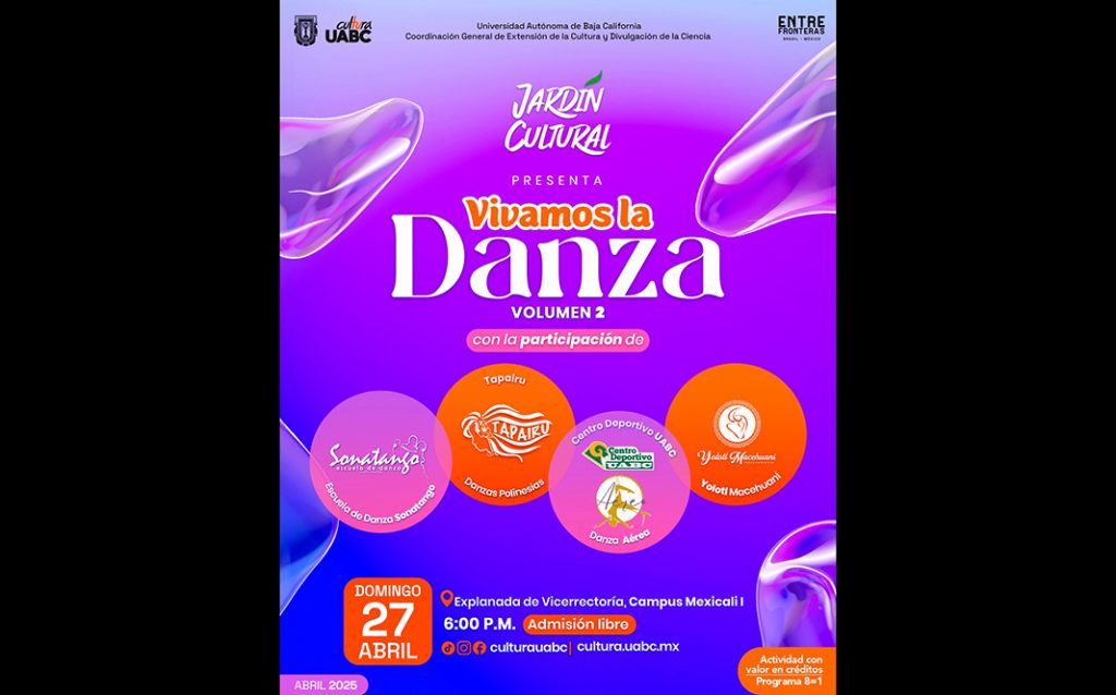 Mexicali. – En el marco del Día Internacional de la Danza, la Universidad Autónoma de Baja California (UABC) presentará de forma gratuita el Jardín Cultural Vivamos la Danza Volumen 2 con la participación de la Escuela de Danza Sonatango, Tapairu Danzas Polinesias, Danza Aérea del Centro Deportivo UABC y Yolotl Macehuani Danza Folclórica, el domingo 27 de abril a las 18:00 horas en la Explanada de la Vicerrectoría Campus Mexicali.