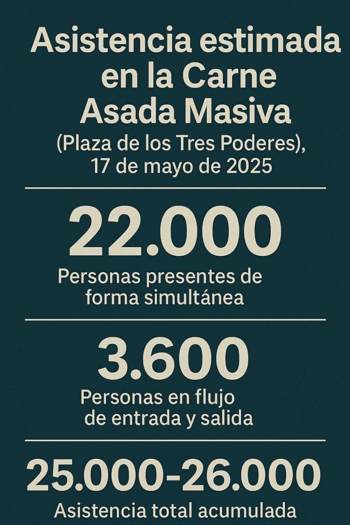 Por lo anterior, se concluye que la participación total acumulada en la jornada fue superior a las 22,000 personas observadas en el punto máximo, alcanzando una cifra estimada de entre 25,000 y 26,000 asistentes únicos a lo largo del desarrollo del evento.