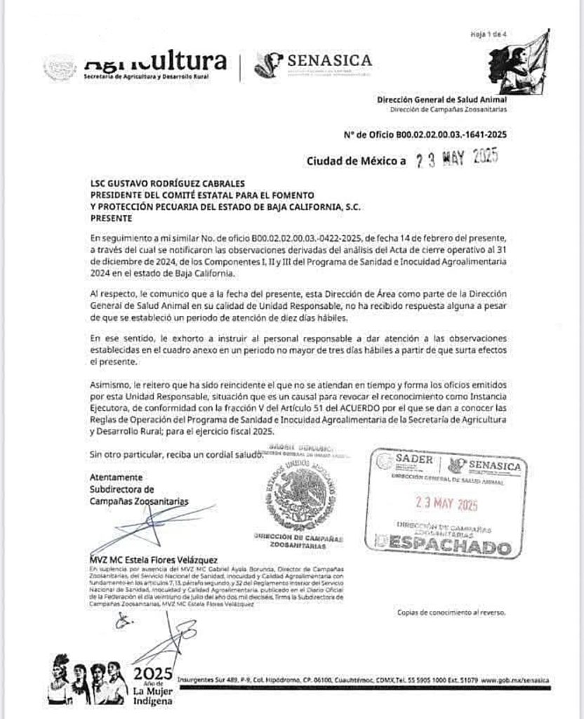 La Dirección General de Salud Animal envió un oficio firmado por la subdirectora de Campañas Zoosanitarias el 23 de mayo pasado, relativo a observaciones derivadas del análisis del acta de cierre operativo de 2024 que no han sido atendidas.