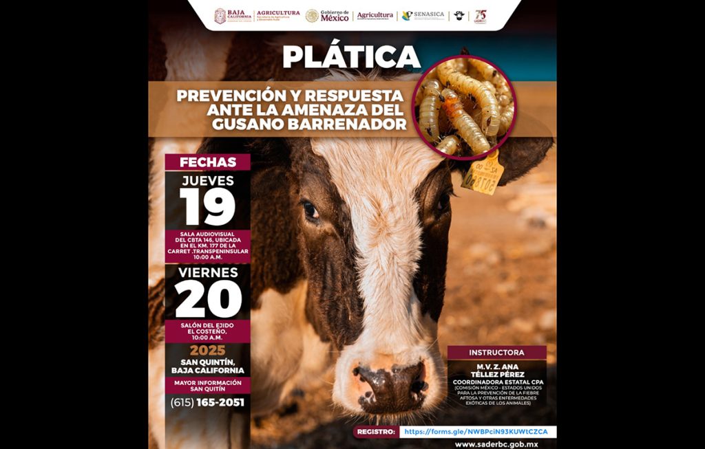Como parte de la estrategia sanitaria de prevención, detección y respuesta ante ganado infectado por miasis, la Gobernadora del Estado, a través de la Secretaría de Agricultura y Desarrollo Rural (SADERBC) y la Comisión México-Estados Unidos para la Prevención de la Fiebre Aftosa y otras Enfermedades Exóticas de los Animales (CPA), realizarán la plática “Prevención y Respuesta ante la Amenaza del Gusano Barrenador”.