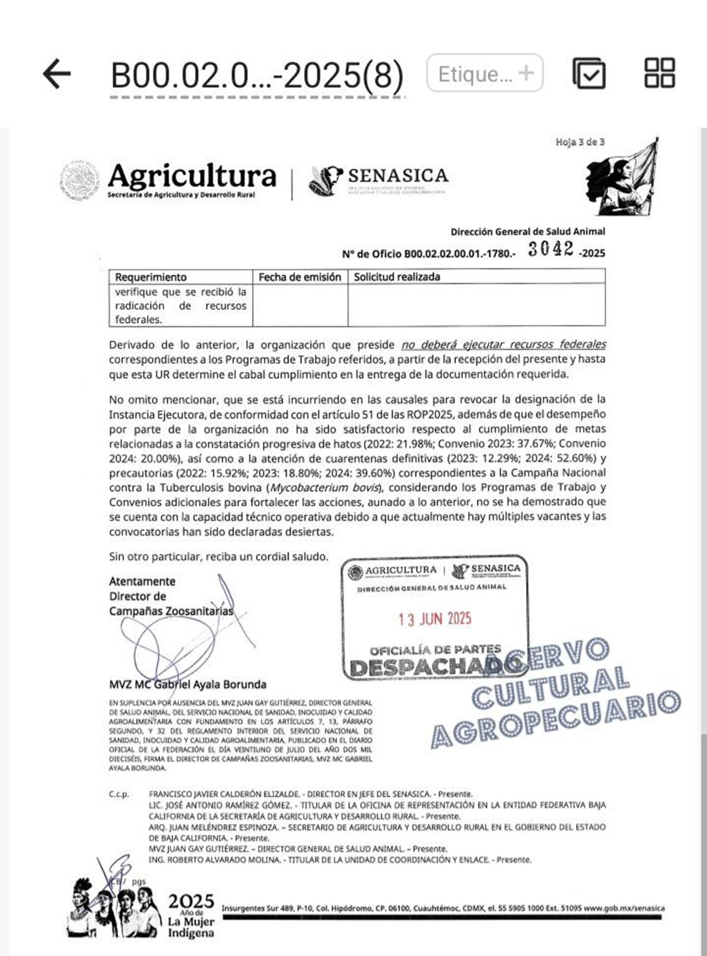 El descaro de los encargados de la sanidad en Baja California es haber recibido 11 oficios de requerimiento, donde no han contestado cómo ha sido señalado en el oficio B00.02.02.00.01.-1780.-, en la falta de capacidad para operar un organismo de sanidad es señalada por la Dirección Nacional de Campañas Zoosanitarias o DGSA por sus siglas y no por la falta de recursos cómo mencionaba Rodríguez Cabrales junto con algunos de sus delegados votantes y es que desde el 2022, la constatación de hatos progresiva (barridos TB) no ha sido cumplida satisfactoriamente, ya que de las metas propuestas por el mismo organismo, sólo logro un pobre y escaso avance del 21.98% en los planes de trabajo de dicho año, pero el 2023 no fué la excepción, ya que sólo cumplieron con el 37.67%, para continuar en 2024 con una nueva caída en su gráfica de trabajo donde según la autoridad federal, solo lograron un 20.00% de las metas propuestas; cabe mencionar que la atención a cuarentenas definitivas y precautorias en 2023 no se quedó atrás y solo tuvo un 12.29 por ciento de avance; para continuar rematando a los productores con el avance del 15.92% del barrido de tuberculosis en 2022 y continuar en 2023 clavando la daga con mísero 18.80% de dichas labores.