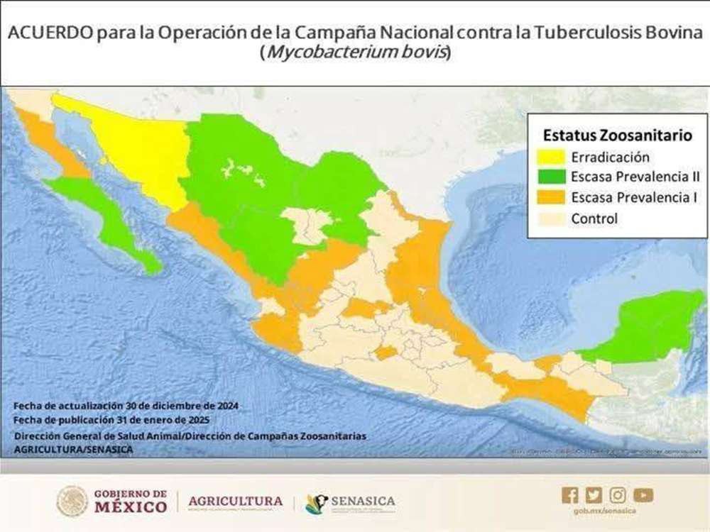 Pero ya pasó lo más feo y ahora viene lo peor, porque si creíamos que no podía ser más mal la cosa, a continuación les mostramos y explicamos lo que va a suceder por la falta de los trabajos que no realizó el Comité Estatal para el Fomento y Protección Pecuaria de Baja California, ya que así como se perdió un estatus internacional por parte del departamento de agricultura de los Estados Unidos en Tuberculosis Bovina, estamos a punto de retroceder en los estatus nacionales cómo se muestra en el documento recibido el 02 de febrero del 2025, donde de una manera muy clara se le hace saber al recién despedido titular de la SADERBC junto con Gustavo Barrenador, que tienen 6 meses para enviar una carpeta con la información que demuestre que son candidatos a lograr un estatus mejor para Baja California en materia de TB, de no ser así, se evaluarán los trabajos realizados cómo pueden apreciarse en el oficio donde se hace mención al artículo 13 del acuerdo de norma contra la tuberculosis bovina, lo que tendrá como resultado que Baja California se convierta en una zona con el estatus más bajo que existe, lo que se conoce cómo zona de control (imagen en mapa).