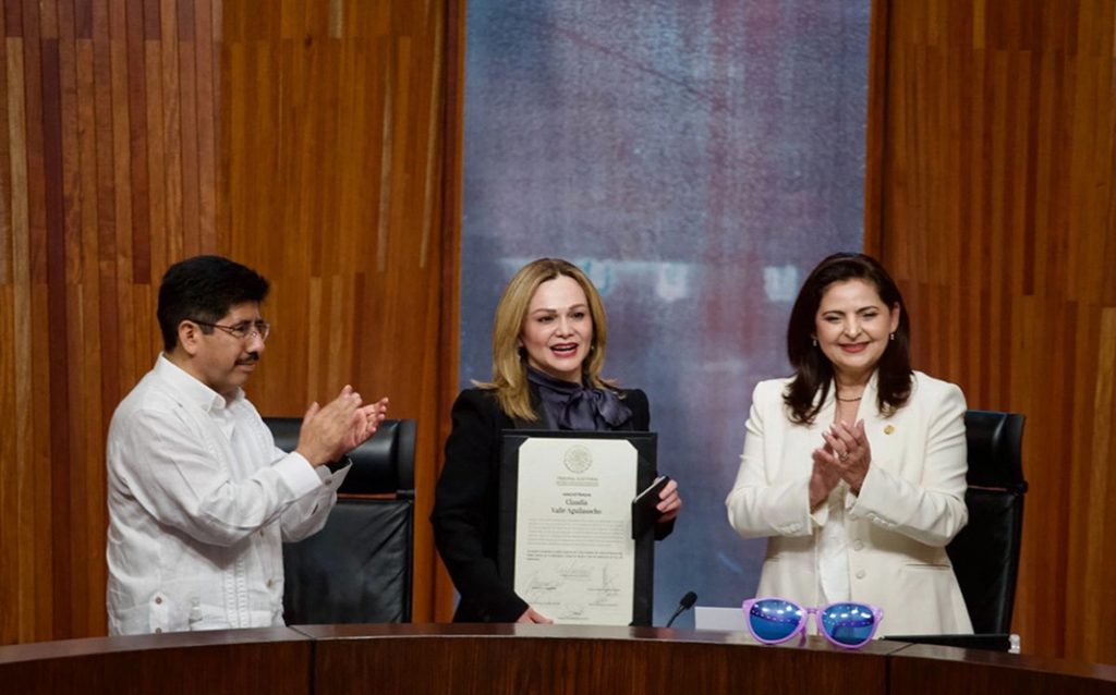 Magistrada rinde protesta. Claudia Valle Aguilasocho (centro) rindió ayer protesta como magistrada de la Sala Superior del TEPJF. La acompañaron la presidenta del Tribunal, Mónica Soto Fregoso, y Hugo Aguilar Ortiz, presidente de la Suprema Corte. Foto Roberto García Ortiz