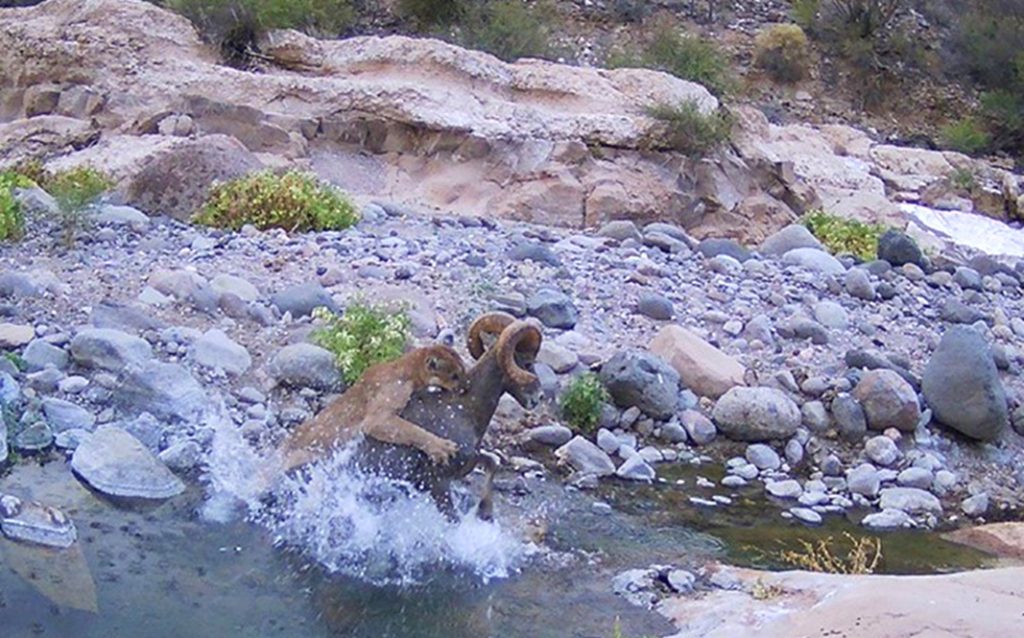 Caza de borrego cimarrón por puma. Foto tomada de la página APFF Valle de los Cirios-CONANP