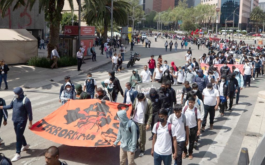 Once años de la desaparición de los 43. Estudiantes y padres de los 43 normalistas de Ayotzinapa marcharon ayer por Reforma hacia la cancillería, donde exigieron la repatriación de implicados en la fabricación de la ‘verdad histórica’ sobre la desaparición de los jóvenes. Foto Alfredo Domínguez