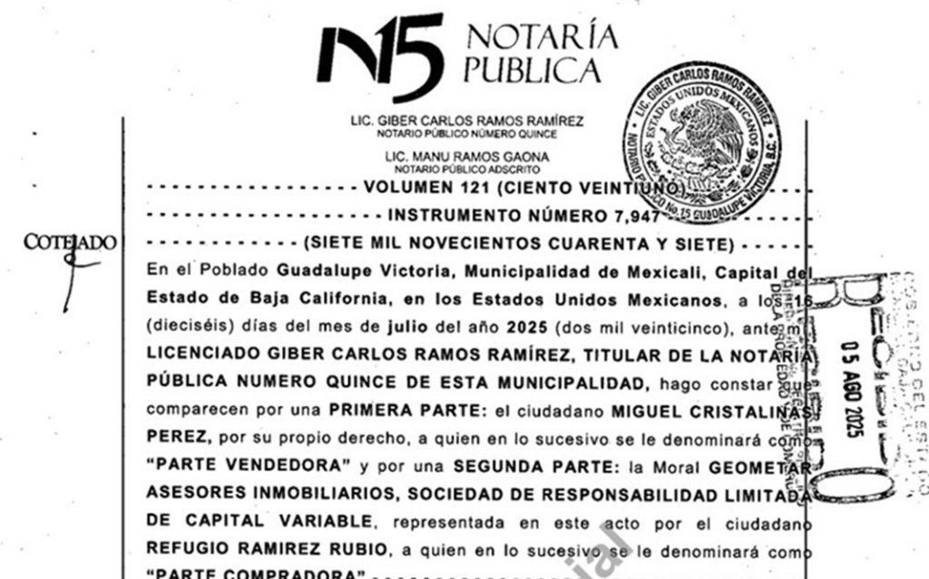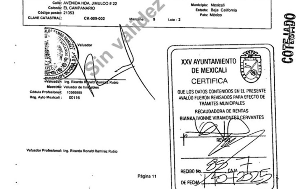Además, para los trámites de la supuesta venta de la propiedad, el Ayuntamiento de Mexicali le selló los documentos a Camarillo Flores, quien en esta ocasión usó el nombre de Rogelio Márquez Lamarque. Dicho sello avala que pasó el proceso de verificación, dando por bueno un avalúo mucho menor que el real, cuando se supone que hacen un análisis del precio del metro cuadrado de la zona, la construcción, las dimensiones, etcétera.