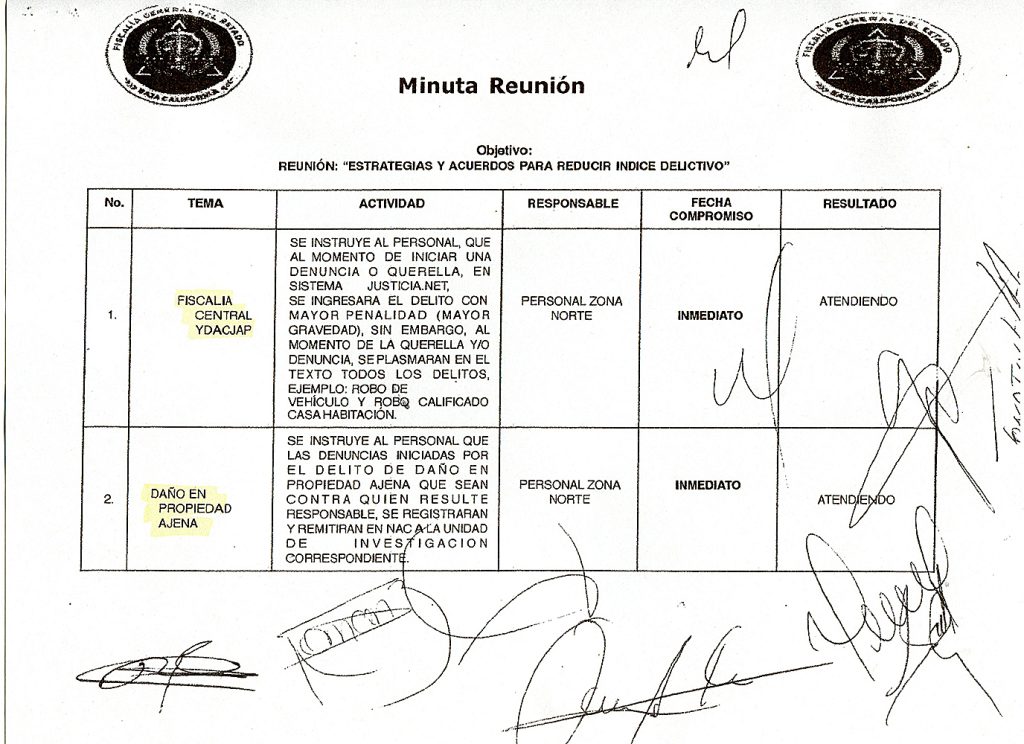 El documento consta de 7 hojas, copia de una minuta de reunión celebrada de las 13 a las 14 horas del 3 de junio de 2024, con el tema: “ESTRATEGIA PARA REDUCR INDICE DELICTIVO (NUC) 2024”, en donde participaron dos encargados de UMAC y una encargada de UJAP, 5 ministerios públicos y dos auxiliares y en 5 paginas se dan instrucciones para el registro de los delito, por cuestión de espacio publicamos la página uno, donde se refiere a dos delitos, mientras en las siguientes se menciona: hostigamiento, desaparición forzada de personas cometida por particulares, violencia familiar y fraude