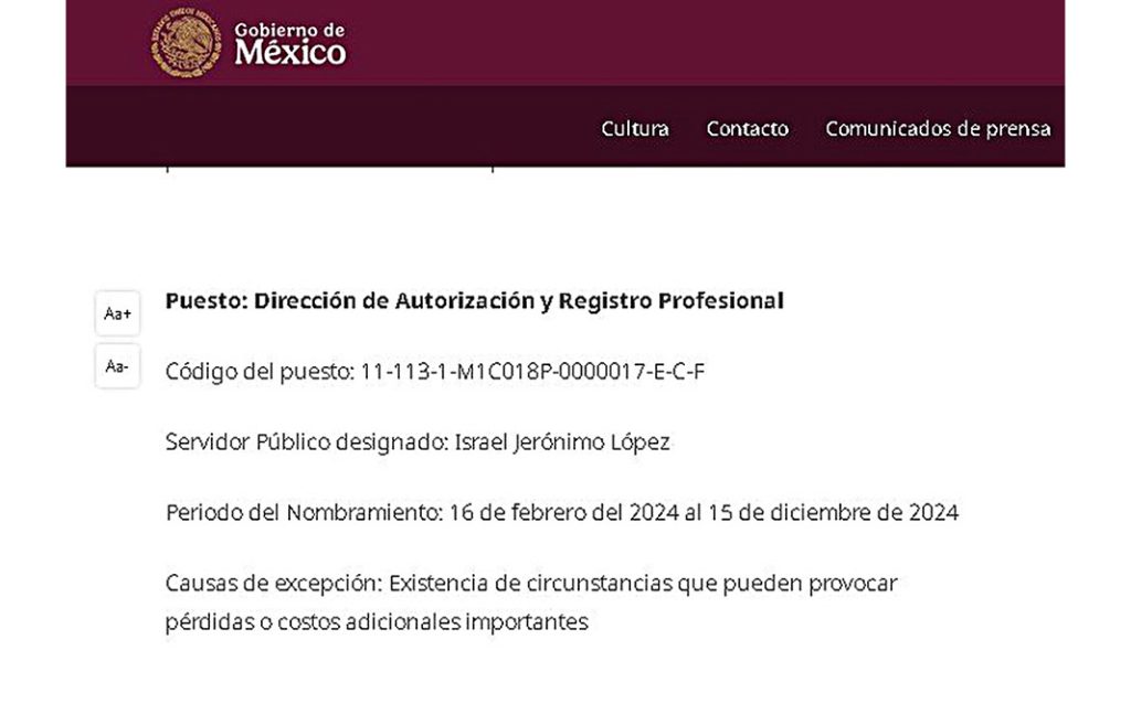 Las cédulas de maestría y doctorado del funcionario fueron emitidas precisamente por el área de Autorización y Registro Profesional, la misma que él mismo encabeza desde el 16 de febrero de 2024 (https://acortar.link/n7bjk4). Ambas cédulas fueron expedidas en abril de 2024, y de forma igualmente irregular: primero la de doctorado (4 de abril) y luego la de maestría (11 de abril).