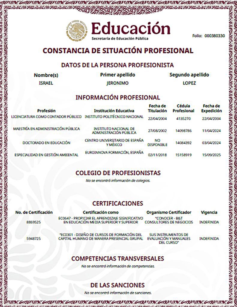 Aún más grave: en documentos oficiales del Gobierno del Estado de México fechados el 22 de septiembre de 2022, el funcionario firmó como “Dr. Israel Jerónimo López”, cuando se desempeñaba como subsecretario de Educación Media Superior. Sin embargo, el portal oficial de la SEP indica que su Doctorado en Educación (cédula 14084392) fue expedido hasta abril de 2024, dos años después de haberse ostentado con ese grado.