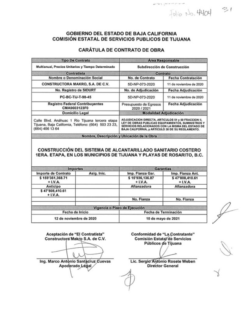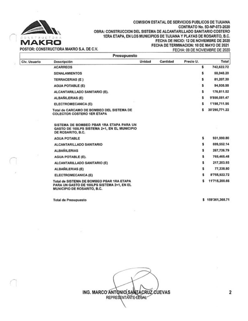De acuerdo con el contrato 5D-NP-073-2020, adjudicado por la Comisión Estatal de Servicios Públicos de Tijuana (CESPT) a dicha firma por un monto de 159 millones de pesos más IVA, la fecha límite para la ejecución de la obra era el 10 de mayo de 2021, pero eso no ocurrió.