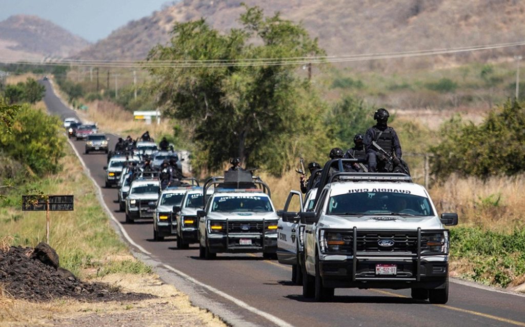 Miembros de la Guardia Civil de Michoacán patrullan una carretera con el apoyo de vehículos blindados tras una ola de violencia en la localidad de Aguililla, cuna del narcotraficante Nemesio Oseguera. Investigaciones demuestran que el CJNG es mucho más que un cártel de drogas. Foto Afp