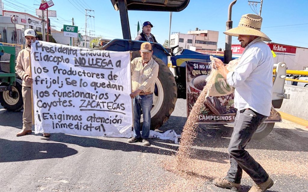 Zacatecas, Zac. Este lunes decenas de campesinos productores de frijol reanudaron sus protestas en distintos puntos de la zona conurbada de la capital de Zacatecas, para exigir solución a los problemas de acopio del grano que cosecharon desde octubre del año pasado, y otros agricultores que siembran mediante el sistema de riego, quienes por su parte exigen al gobierno agilizar los trámites burocráticos, para regularizar sus concesiones para el aprovechamiento de aguas subterráneas y poder acceder a programas de subsidios energéticos.