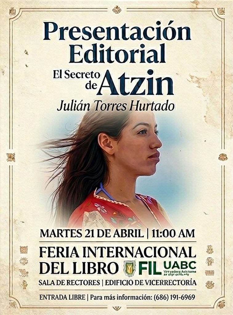 El periodista y escritor JULIÁN TORRES HURTADO presentó con gran éxito su novela EL SECRETO DE ATZIN, durante un agradable y concurrido evento en la Sala de Rectores de la UABC. Lo acompañaron importantes personajes del activismo social y de la comunicación, así como estudiantes y público en general. La novela, según describe, «ESTÁ INSPIRADA EN LA RIQUEZA QUE TIENEN LOS PUEBLOS ORIGINARIOS DE MÉXICO» y se desarrolla en una comunidad ficticia a la que llama CHERANCUTIRO, donde la protagonista, ATZIN (AGÜITA), se desenvuelve en una trama muy interesante, en un inspirado texto en la que se describen los encantos naturales de la región y los valores de la amabilidad, la sencillez y la calidad humana de sus habitantes. La presentación de la ópera prima de este destacado comunicador se llevó a cabo en el marco de la Feria Internacional del Libro, efectuada en las instalaciones de la Vicerrectoría.